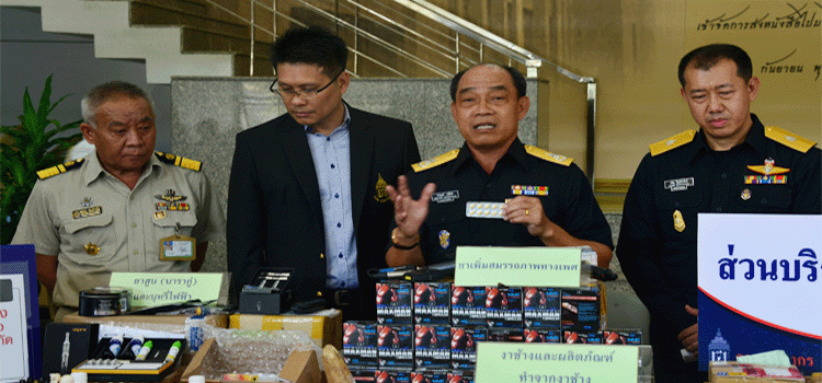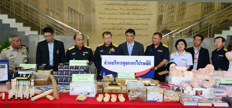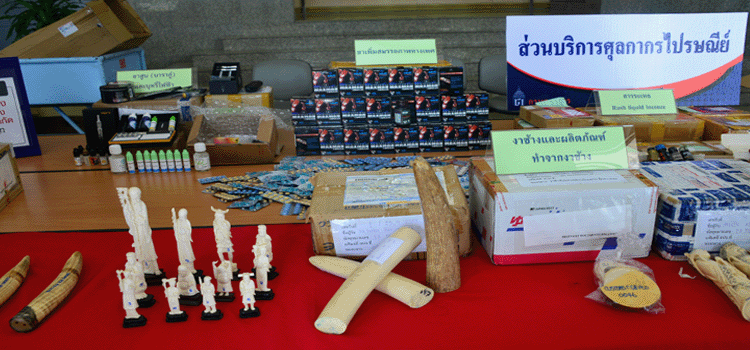 Mr.Prayudh Maneechote, Director of Bangkok Customs Bureau displayed elephant tusks and tusk products. Rush ilquid incence, Pornographo, Baraku, Sexual